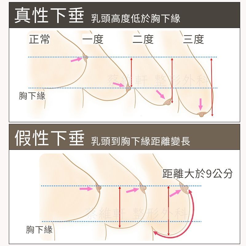 - 三度下垂:乳頭高度低於乳下緣,而且角度朝下,位於整個乳房的最低點。