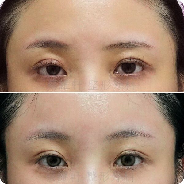 圖示為內視鏡前額拉皮手術,手術後改善眉眼距離、眉尾下垂與雙眼皮寬度。