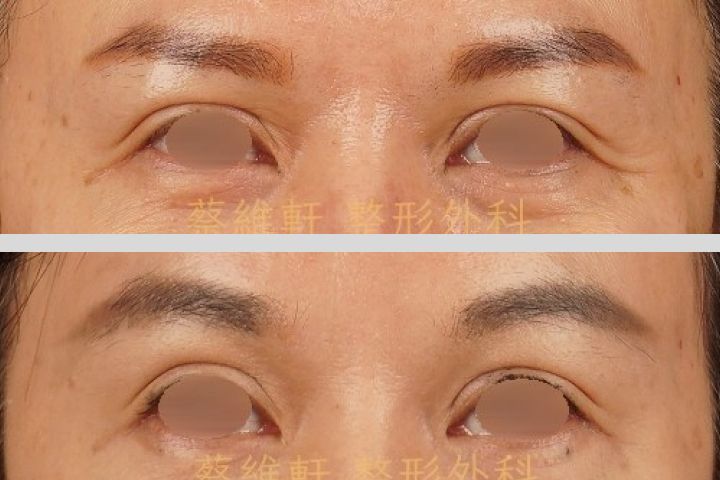 沿著眉下緣將過多眼組織移除,再用可吸收骨釘將眉毛上提固定,改善眉毛下垂、眉壓眼等困擾。